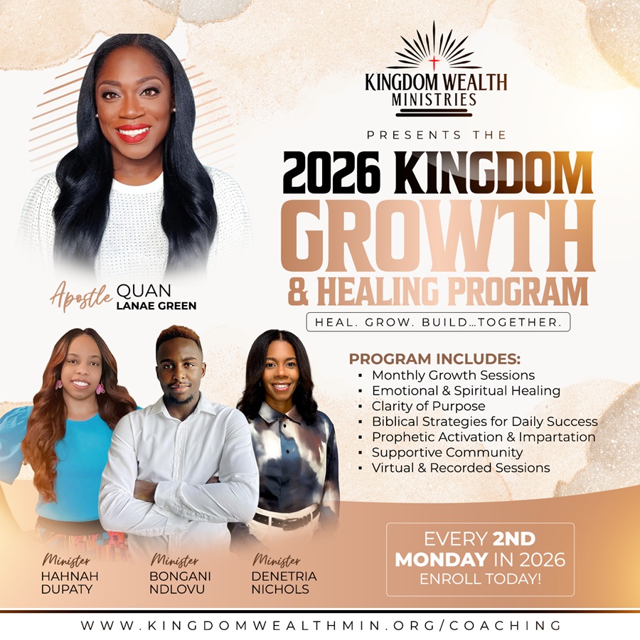 The 2026 Kingdom Growth & Healing Program is designed for anyone who is ready to grow spiritually, overcome personal barriers, and step confidently into the life God intended. This year-long journey will help you strengthen your relationship with God, heal from what has held you back, and build the spiritual foundation you need for the next level of your purpose. Through monthly sessions, practical biblical teaching, and a supportive community, you will receive the tools and guidance necessary to grow, mature, and heal in every area of your life.